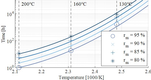 If the annealing time and temperature for a certain Rm are taken from the diagram in Figure 10, an Arrhenius diagram can be obtained (Figure 11). On the ordinate the annealing time in h is plotted in base 10 logarithmic scale. The abscissa is the annealing temperature in 1000/K. In addition, two different curve fittings are shown. It can be seen that with a linear curve fitting, there is an overestimation of the time to reach a relative residual strength for the data points at 160 °C. Therefore, due to the limited data availability, a quadratic fit is used for the temperature range 130 °C – 200 °C as a conservative estimate regarding the annealing time and annealing temperature compared to a linear fit. For temperatures below 130 °C, the extrapolation of the linear fitting curve for the relative residual strength is used, which again represents a conservative estimate compared to the quadratic approximation for temperatures below 130 °C.