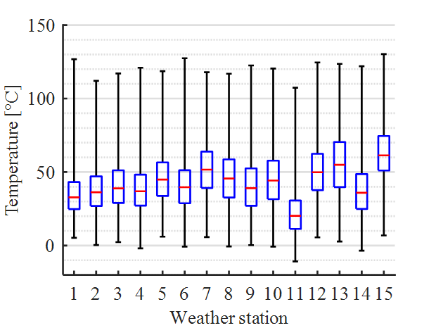 The constant profile HU is used to compare rm at different considered climatic regions. Figure 12 shows a box-plot of the calculated fitting temperatures of all weather stations from 2010 to 2018. The temperature median values occurring at individual weather stations are shown in red. The boundaries of the blue boxes are defined by the quartiles. Furthermore, for each weather station the maximum and minimum value is shown. It can be seen that the median values of determined temperatures are in a moderate range. With a median maximum of just over 60 °C for the CMSJ at weather station 15, they are well below 81.32 °C at which significant loss of tensile strength can occur at all. However, the maximum values for each weather station clearly exceed 100 °C in all cases.