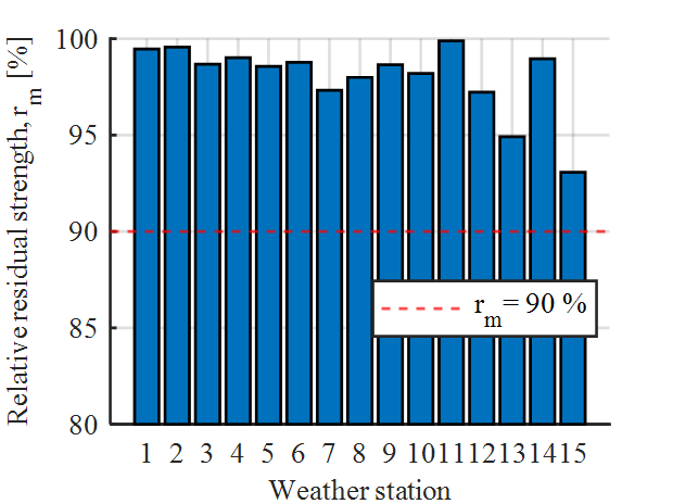 In Figure 13, the calculated rm values based on the temperature data from Figure 12 are shown. For the data of all weather stations and the HU current profile, previously defined requirement of a minimum of 90 % of the initial strength is achieved. In particular, the loss of tensile strength at weather station 15 is the highest compared to the other weather stations.