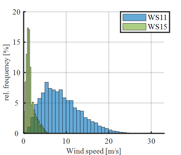Reasons for lower rm values at weather station 15 can be explained by observing the wind speeds recorded at the individual weather stations. Figure 14 shows the relative frequency of occurring wind speeds at weather station 11 and 15. Weather station 11 is selected since the lowest loss of tensile strength is observed here. It can be seen that the relative frequency of wind speeds at weather stations 11 and 15 show a clearly different distribution. High wind speeds at weather station 11 are more frequent than those at weather station 15. The relative frequency of wind speeds from the other weather stations are between these two extreme distributions. For this reason, the higher loss of tensile strength at weather station 15 compared to all other weather stations can be attributed to the high frequency of low wind speeds. Therefore, only weather station 15 is considered in further analysis for the comparison between individual current profiles, since it represents the worst case with respect to wind speed and fitting temperature compared to other weather stations.