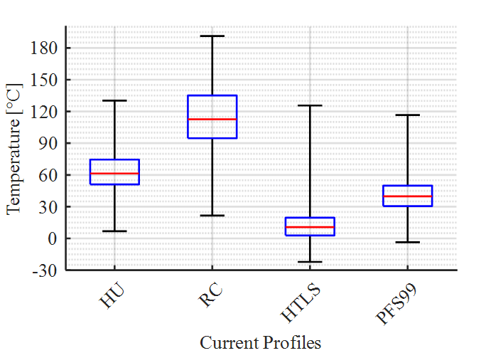 The calculated temperatures for the different current profiles with the weather data from weather station 15 are shown in Figure 15. As with the HU profile, moderate median values of the occurring temperatures can be seen for the HTLS and PFS99 profiles. As expected, the reference profile RC shows the highest median value of calculated temperatures as well as the highest maximum value.