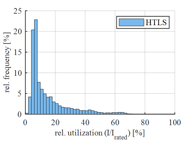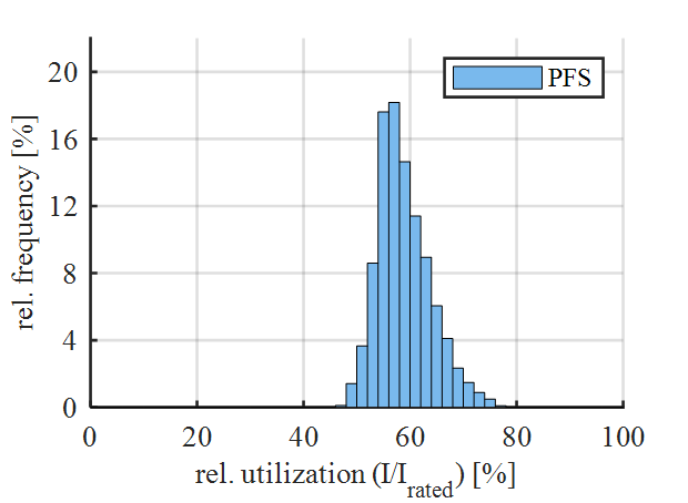From the measurement data of different TSOs, a profile is selected which originates from an overhead power line section on which HTLS conductors are installed. This profile was chosen to compare an actual HTLS overhead power line to the PFS profile. Compared to this profile, the PFS99 represents a highly utilized line. Figure 5 plots RCU versus relative frequency of occurrence for this profile.