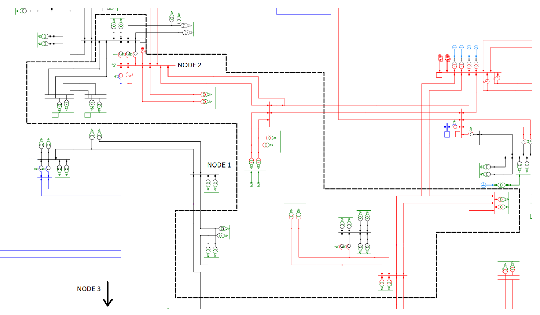 The power system model is based on a reduced version of the detailed local DNO power system model (the SPEN model), as shown in Figure 2. The following assumptions were applied to the power system to reduce the scope to ‘local power flows’ within the Glasgow Council area: