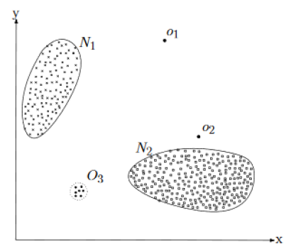 The data has two “non anomalous” regions (N1 and N2) because most observations lie inside them, points that are far from such regions (o1, o2 and O3) can be defined as anomalous.