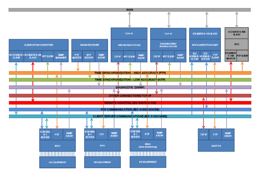 According to the IEC 61850 model [2], the exchange of information within the substation is based on a fiber optic IEEE 802 ethernet LAN connecting substation level devices (substation computers, HMI Workstation, Engineering workstation and GNNS receiver) with bay level IEDs. These are classified in three classes according to their main function: Bay Protection Units (BPU), Bay Control Unit (BCU), Bay Monitoring Unit (BMU).