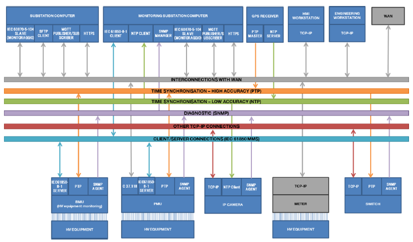 Figure 2 – Protocols and logical connections implemented over the protection, control and grid monitoring LAN