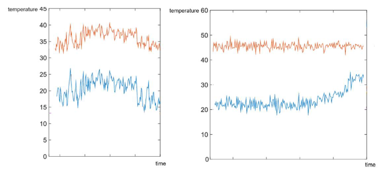 By cross-analysing time series from different sensors we can detect when patterns break or new ones emerge. Figure 7 gives an example in which oil temperature (red) and external temperature (blue) are observed for a transformer.
