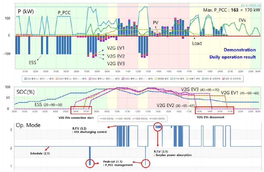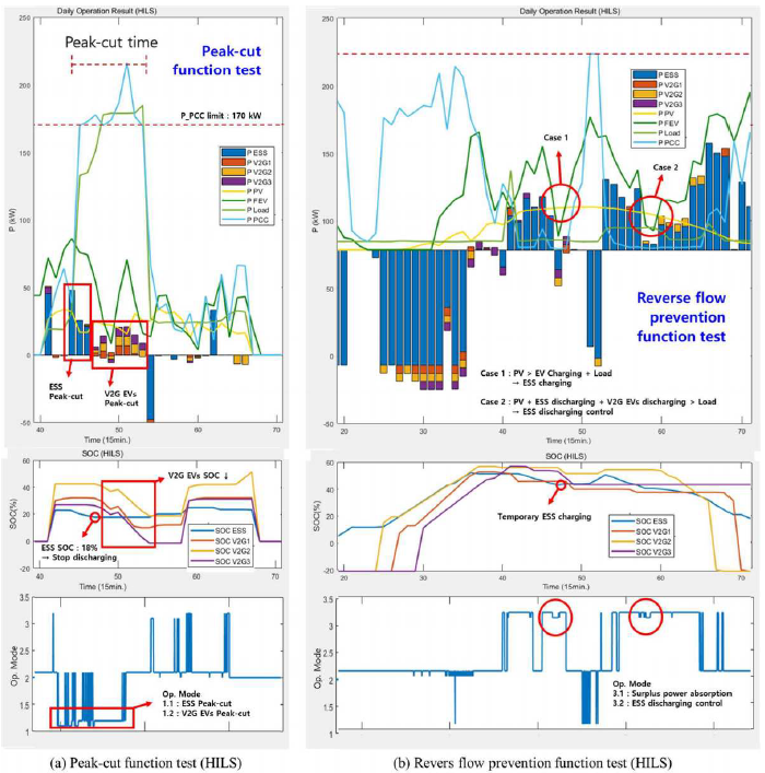 The HILS test confirmed and upgraded the performance of peak-cut and reverse flow prevention mode, which are main functions of the EMS. In figure 7, parts of daily operation results are shown to focus on function tests. The first and second graphs from above show the active power output and SOC (every 15 minutes) of distributed energy resources (DER) in the V2G EV-MG and the third graph shows the operating mode of the EMS over time (every 1 seconds). In the first graph from above, the light blue line indicates the active power of the PCC (receiving power from the grid), the yellow line indicates the PV power output, the light green line indicates the electric load, and the green line indicates the charging power of EVs. The blue, orange, yellow, purple bars indicate the charging/discharging power of the ESS and V2G EVs. The negative value indicates charge and positive value indicates discharge. In the third graph, 1.1 and 1.2 indicate that the EMS is operating in the peak-cut mode, 2.1 is in the schedule mode, 3.1 and 3.2 are in the reverse flow prevention mode at the time.