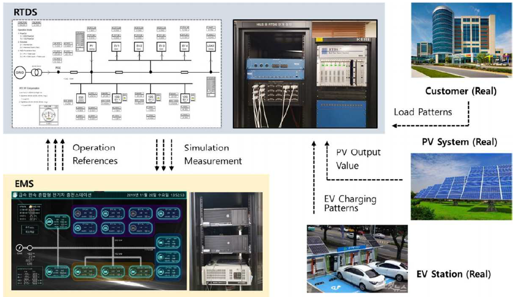 Before the demonstration test, the HILS test was performed to check the operation of main functions of the EMS. In order to apply situations to the EMS as close to reality as possible, realtime simulation environment using RTDS was built. The components are modelled using RSCAD very similar to the demo site specification. The ESS, all EVs, PV system and load are designed with PQ sources and SOC is implemented as a power accumulation formula considering efficiency. To create non-artificial input variables, data from the real customer, PV system and EV station was transmitted to RTDS in real time.