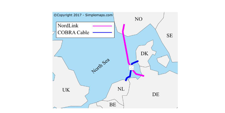 Figure 2 - Map of the North Sea region presenting NordLink and Cobra cable. The dc-dc converter is proposed at the crossing point
