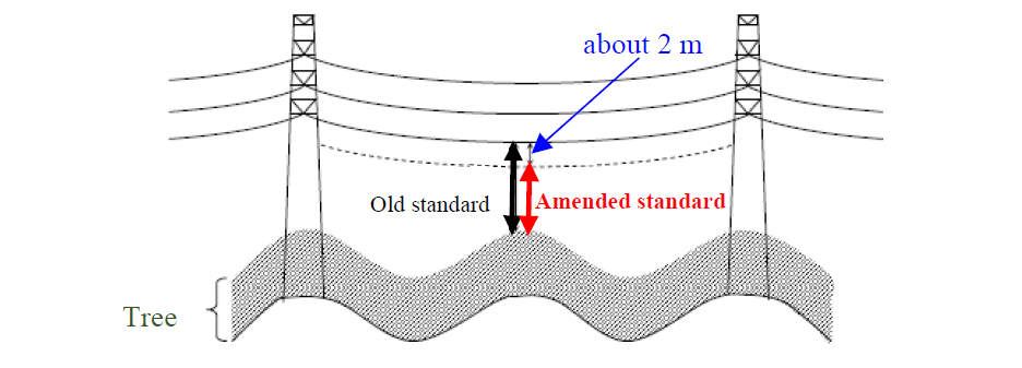 This amendment of the electrical clearance will reduce the height of 500 kV towers by about 2 m, thereby reducing the cost of materials, transportation, and assembly of the towers. In addition, by reviewing the electrical clearance from the conductor to the tree, the area of trees to be cut down as obstacles can be reduced, especially when the conductor swings sideways in the wind. Therefore, it will reduce not only the compensation cost of new OHL, but also the maintenance cost of existing OHL.