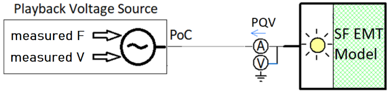 The purpose of this section is to evaluate the accuracy of the EMT model of the SF in emulating the behaviour of the actual plant. For this purpose, the frequency and voltage signals measured at the terminal of the SF, for each event, were applied at the point of connection (PoC) of the SF’s EMT model, using a playback set-up as shown in Figure 3. The active power response of the SF model to the injected signals was then compared against the measured active power response of the SF.