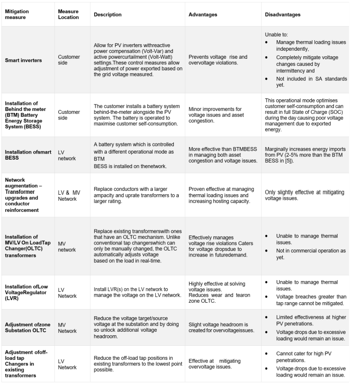 This section provides details about the solutions that can be implemented to mitigate technical impacts of increasing penetration of PV on Distribution networks and to further increase hosting capacity on a network. Many measures have been mentioned in research however; there is a lack of comprehensive analysis of advantages and disadvantages of them [2]. These methods are tabulated in Table 1, where some advantages and disadvantages are mentioned, furthermore, the placement or responsible party is also highlighted [2, 3, 4, 5]. The advantages and disadvantages of each measure is classified in terms of mitigating or managing voltage violations or asset congestion issues caused by increasing PV on Distribution networks. These methods have been assessed on various types of networks theoretically using simulation tools.