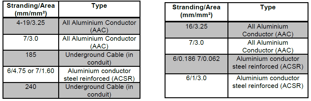The LV and MV conductors that could be considered for this option is tabulated in Table 2 and Table 3, respectively.