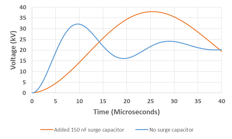 Figure 8 - System-source fault for 17.5 kV rated circuit breaker and 100 kA fault level without and with added surge capacitor at 150 nF