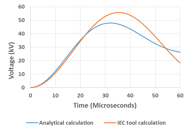 Figure 9 - Calculated TRVs using the analytical approach and the IEC tool for 17 kV, generator circuit breaker out-of-phase switching with added surge capacitors