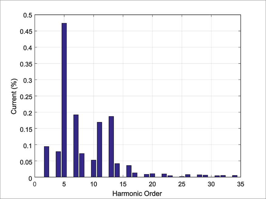 Only the rated power operation at 2.5 MW was considered in this study. The corresponding harmonic spectrum of the output current as a percentage of the rated current is shown in Figure 2, where the total harmonic distortion (THD%) can be observed to be 0.786%.