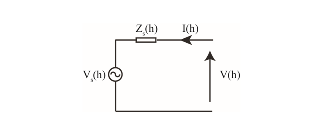 The frequency-dependent Thevenin impedances Zs(h) and the corresponding source voltage Vs(h) can be derived using the expressions (4), where it is valid for any two different background conditions assuming the inverter operation is fixed.