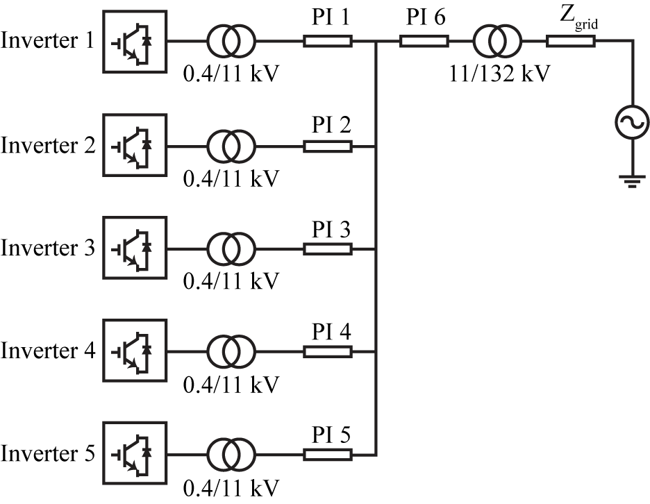 where, F,N,v and l are the maximum frequency range, number of ∏ sections, propagation speed in km/s and line length in km respectively. From (5), it was confirmed that to represent each cable segment, a single ∏ section to be adequate. The solar farm layout is shown in Figure 6 where each inverter is connected to a 0.4 / 11 kV step-up transformer and connected via underground cables with different lengths to an 11 kV busbar. The 11 kV busbar is connected to the 11 / 132 kV grid transformer via a 2 km long cable. Parameters of the cables extracted using [24] are listed in Table 4.