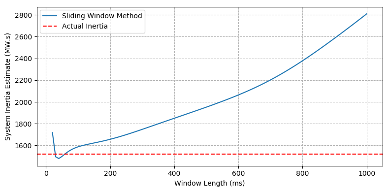The network fault causes a transient component in the frequency trace, which results in overestimates of system inertia with the sliding window method when the window length is small, as shown Figure 6a for window lengths <200-ms. This is broadly similar to how the sliding window method performs with the oscillatory frequency trace observed in Case 2. In that previous case, the sliding window method is more accurate beyond a "knee" point window length, where the effects of the oscillations are filtered out. In this case, the knee point occurs at a window length of 210-ms and a system inertia estimate of 14,000 MW.s.