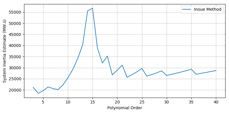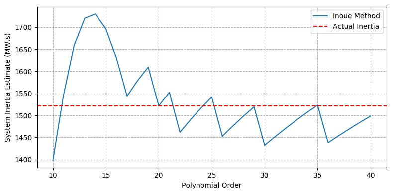 Similarly, the Inoue method will tend to over-fit the frequency trace (and particularly the transient component) at high polynomial order. This can be seen in Figure 6b, where the system inertia estimate is below the known generator inertia at polynomial orders >15. The Inoue method does not credibly provide any useful information regarding the correct range for system inertia.