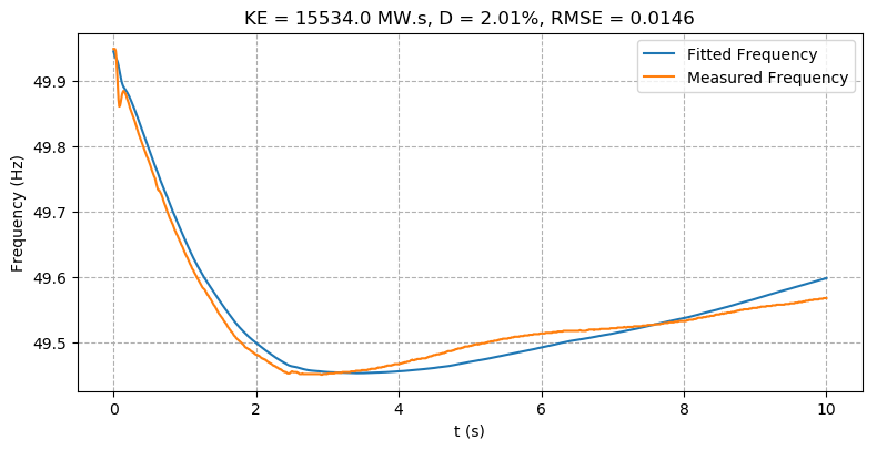 The model fitting results in Figure 4c show good alignment between the simulated and measured frequency traces (RMSE=0.0095) and the inertia estimate of 19,610 MW.s is on the lower end of the sliding window and Inoue estimate range. This suggests that the actual system inertia is likely in the 19,000 - 21,000 MW.s range.