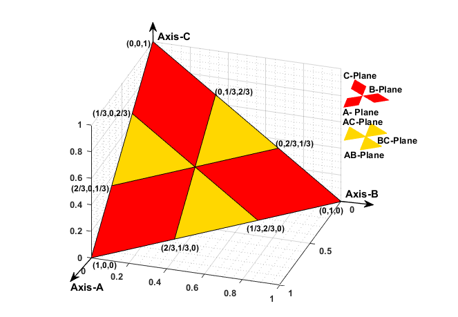 For classification of different CSFs, CCFs and EVFs, a G3DFP as illustrated in Fig. 5(a). It is an amalgamation of three-dimensional triangular plane and hexagonal planes considering three perpendicular axes with equal length. The triangular fault plane shown in Fig. 5(b) is for CSFs and hexagonal fault plane shown in Fig. 5(c) is for CCFs/EVFs. The fault coordinates of this G3DFP representing the three axes as the three phases A, B, and C of the transmission line have been calculated using equations (13-15) respectively. According to eqn. (16), presence of ground fault (G) has been distinguished. Moreover, fault coordinates have been calculated for different fault planes/sub-regions such as phase-to-ground and phase-to-phase faults.