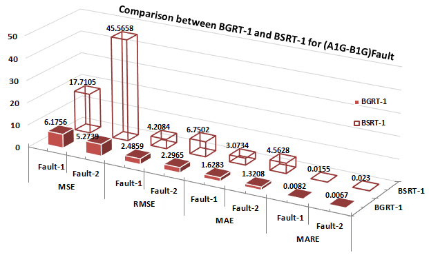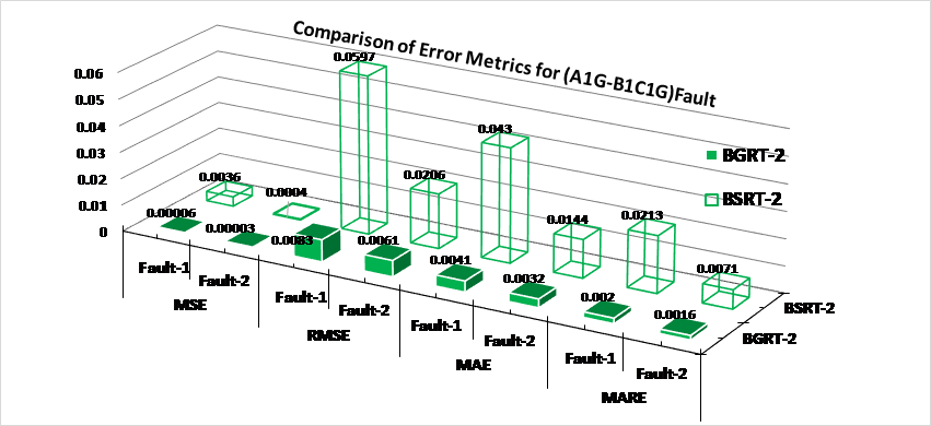 f = 0°, 90°, 270° respectively. Fig.15(a-b) shows the performance of BGRT-1 module for variation in sampling frequency in case of fault1 (A1G) and fault2 (B1G) of a cross-country fault (A1G-B1G). From Fig.16 (a-b), the MARE is decreased linearly in case of fault1 and fault2 with respect to the variation in SNR. The comparative assessment has been done thereby comparing overall performance assessment of different ERT modules such as BGRT and BSRT which elaborates comparison of outcomes of training/testing of different fault locator modules. Fig.17 exemplifies the comparison of error metrics of BGRT-2 and BSRT-2 modules for a CCFs (A1G-B1C1G).