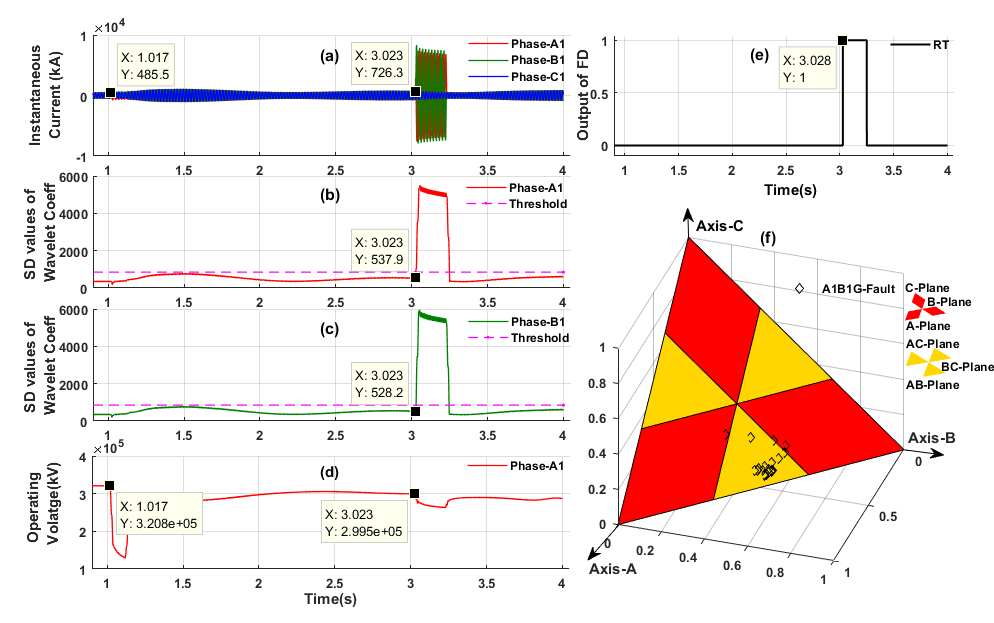 For FC scheme, the change in wavelet energy has been normalized using eqn. (13-16) to calculate the fault coordinates. These fault coordinates have been calculated by through the normalization of max. change in wavelet energy in a recursive window (½-cycle) and defined a general threshold set value, and then the faulted samples are projected on the respective fault plane of a generalized three-dimensional fault plane (G3DFP) to identify the corresponding fault-plane for classification of CCFs/EVFs.