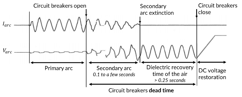 Figure 1 - Illustration of the arc current and voltage during the auto-reclosing procedure. Figure based on paper [4]