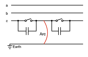 A shunt capacitor across the line breaker could be another solution. In normal operating conditions, the closed capacitors are shorted by the line breakers. When a fault occurs, the circuit breakers open and the secondary arc current is conducted into the capacitors during the dead time. According to [4], this circuit has a similar effect to that of four-legged shunt reactors. With appropriately dimensioned capacitors, the capacitive coupling can be compensated. It is also possible to introduce a single capacitor at one end of the line.