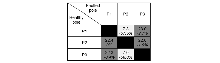 All six combinations of DC pole positions on the tower were simulated leading to a total variation of the SAC of 13.8 A (56.5%). Pole positions were named P1, P2 and P3 as shown in Figure 12.