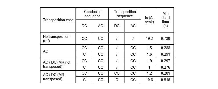 [17] and [4] present two transposition methods for double circuit AC transmission lines, with different costs and effectiveness. According to an example studied in [4] of a 700kV and 300km double circuit AC line, the most common line transposition type can reduces the SAC in AC of 30% and thus the dead time of 24%. For hybrid AC/DC transmission lines, the same considerations can be drawn. With the transposition, the three fields generated by the AC phases compensate and the overall coupling with the DC poles is therefore reduced [17].