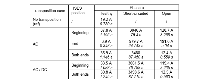 Ss Since HVDC lines are interesting for long-distance transmission, it is highly possible that the existing AC line, candidate for the upgrade from AC to DC, would already be transposed. The HSES (High-Speed Earthing Switches) study was then directly conducted with transposed lines. Simulations were then conducted with the same additional fault states presented in section 5.2.1.2 with both transposition and HSES either on both line ends, or only one. The fault always remained at one of the worst locations: 50 km from the beginning.