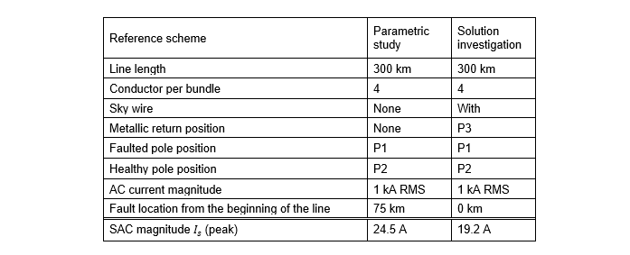 The SAC of the reference scheme built for the parametric study (see appendix 7.3) is 24.5 A (peak). This value was used as a reference to calculate the percentages in section 5.1, to visualize the variations cause by parameters and between parameters. The influence of the metallic return on the SAC was not studied in the parametric study.