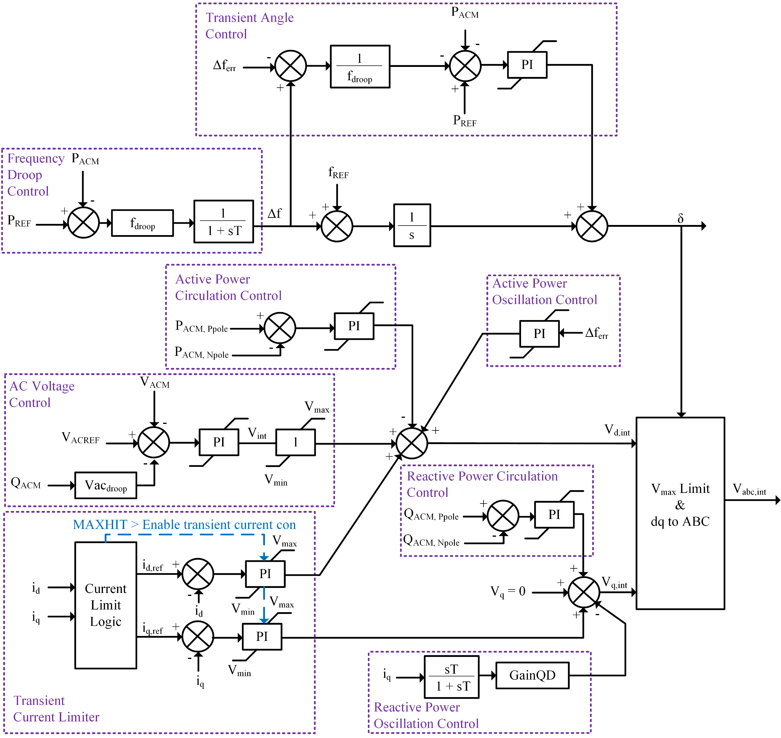 Transient Current Limiter: Maintains the converter current within the limits defined by the IGBT short-term current capability. The controller is activated when the converter AC current is close to the limit. Activation of the controller causes the converter to operate as a current source by freezing the normal grid forming controllers. If the current returns to acceptable levels, the controllers are released and regular grid forming control is resumed.