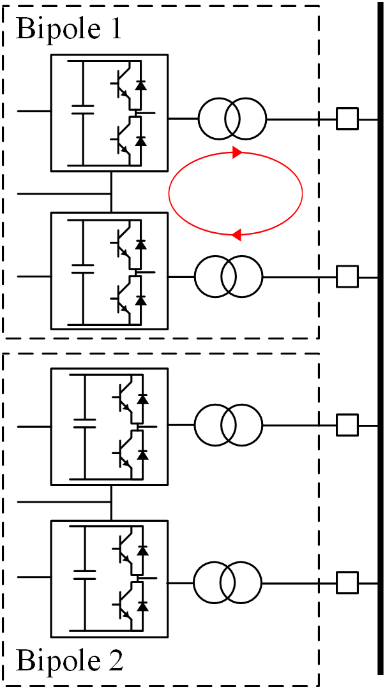 There are unique challenges associated with the parallel operation of grid forming bipole HVDC systems. Existing offshore HVDC systems in operation use symmetrical monopoles with a single frequency controller. In a bipole system, each pole requires its own frequency controller. The parallel controllers may fight each other to regulate the PCC frequency, resulting in power circulation between the positive and negative poles of the same bipole.