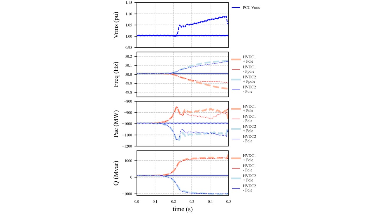 Figure 6 shows the PCC RMS voltage and waveforms for the four offshore HVDC converters for a bolted, 100 ms, 3ph-g fault at the 400 kV PCC, followed by a trip of 500 MW of wind generation. The disturbance results in the PCC voltage and converter power decaying to zero. At fault clearing, the HVDC systems quickly provide the reactive power support necessary to recover the AC voltage and resume the power transfer.