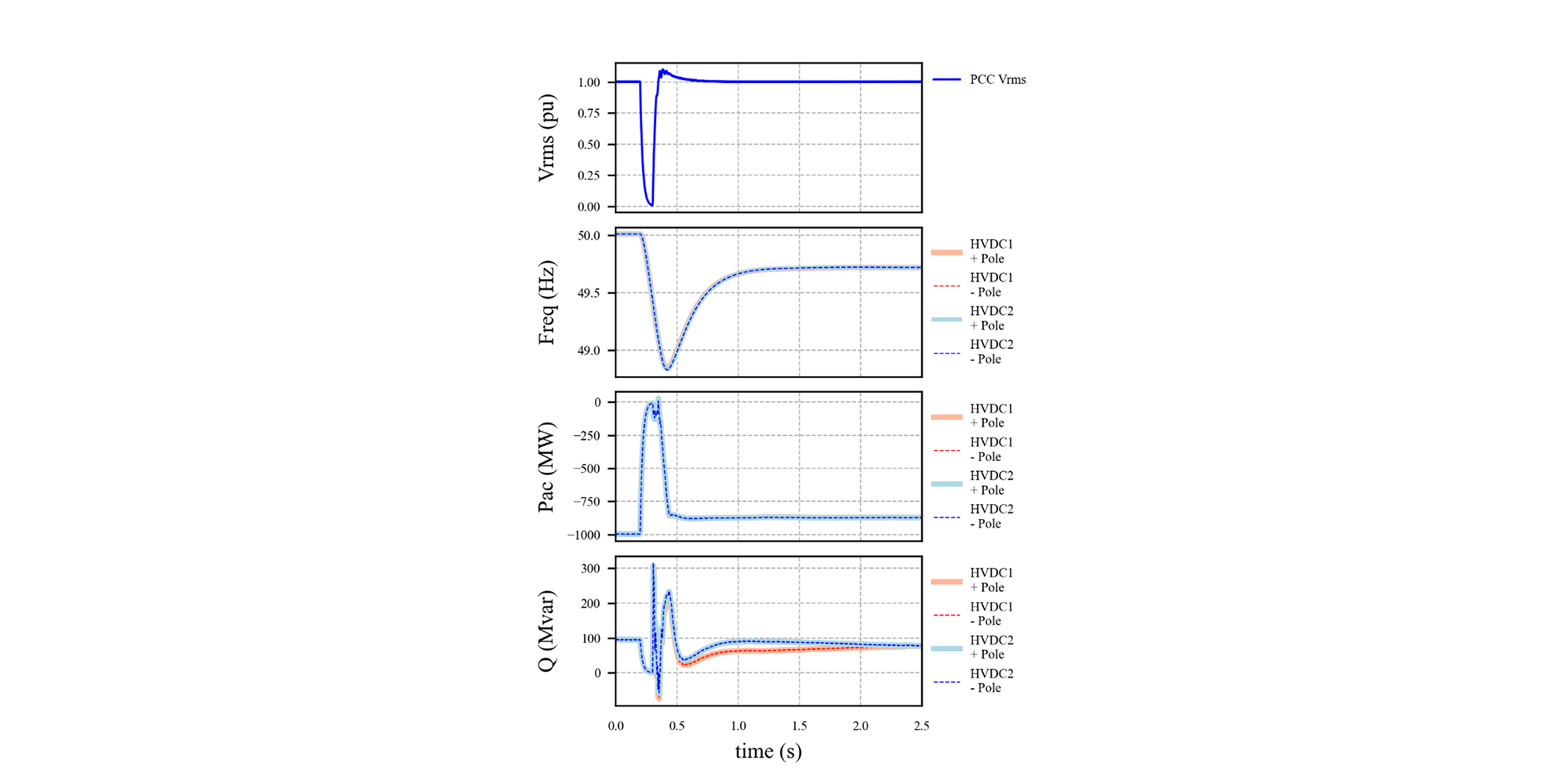 The healthy offshore HVDC converters increase their reactive power injection to the PCC to support the voltage during the fault. The reactive power injected by the three healthy converters flows to the short circuit through the freewheeling diodes of the blocked converter, resulting in very high reactive power absorption (~ 3 GVAR) by the offshore converter of the faulted pole. The voltage quickly recovers after the faulted pole is isolated and the post-fault power transfer returns to 1 GW on the three healthy poles. Note that the post-fault power transfer is the same as pre-fault due to the cross trip of 1 GW of wind generation, that is, the amount of generation cross trip is equal to the initial power transfer on the faulty pole.