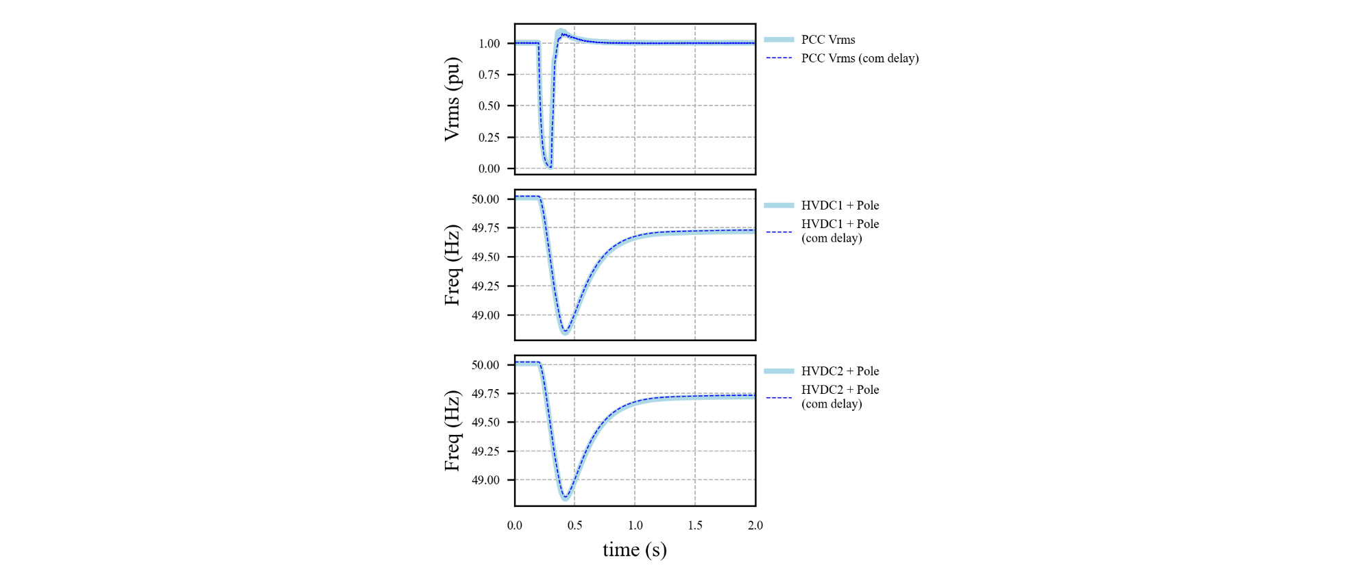 A bolted 100 ms, 3ph-g fault at the offshore PCC with a trip of 500 MW of wind generation was repeated with a communication delay between the offshore frequency regulator and the pole-level controls. For this test, a communication delay of 1 ms was considered between the offshore frequency regulator and the pole-level controls of HVDC system 1, and a 20 ms delay to the pole-level controls of HVDC system 2. Figure 7 shows the offshore PCC voltage and frequency order of the two positive pole converters for both HVDC systems with and without the communication delays. It is shown that the signal delay has negligible effect on the system response to the fault. This test shows that the proposed grid forming control concept can be implemented if the offshore converters are physically separated by a distance.