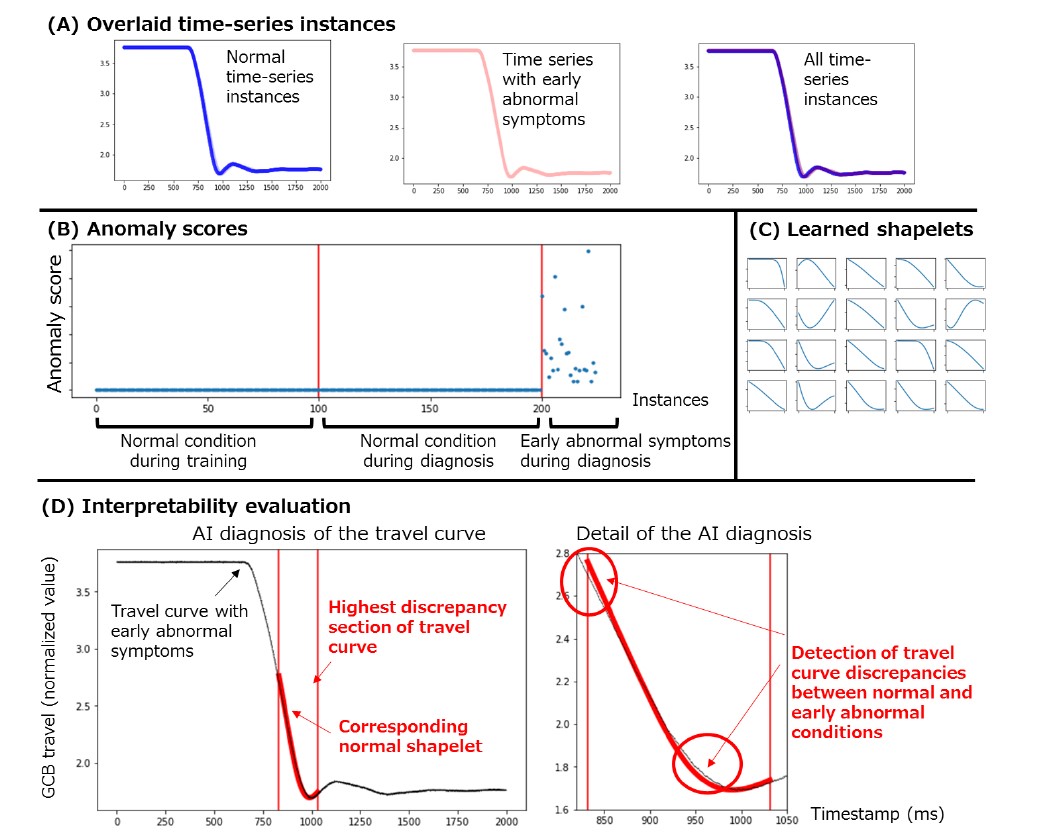 In the existing AI diagnostic methods that provide interpretable diagnostic results by automatically discovering shapelets, both abnormal and normal time-series instances are required for training, but OCLTS can be trained using only normal time-series instances. Moreover, when detecting anomalies, OCLTS can identify the sub-waveforms that deviate from the normal and representative sub-waveforms (shapelets) and cause the anomaly score to increase. Therefore, with such high interpretability for anomaly detection, it can be expected that the investigation of the cause of anomalies can be effectively advanced in conjunction with methods such as FMEA, based on the change aspect to the unusual state (change in a breaker opening/closing speed and its travel curve).