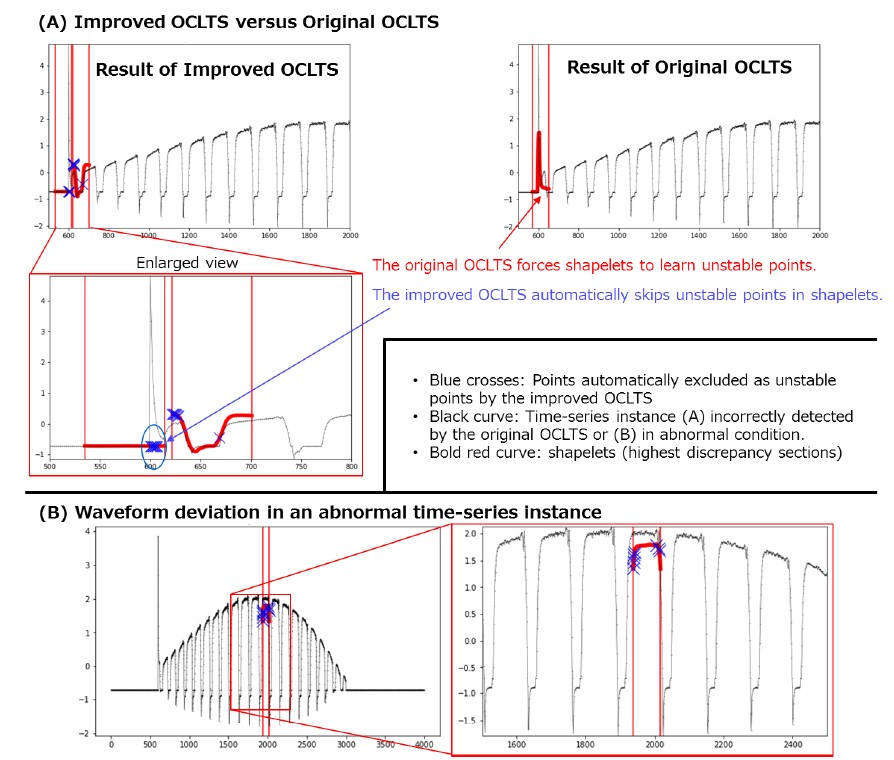 In Fig. 6(A), we compare the shapelets learned by the improved and original OCLTS on the normal time-series data, where the anomaly scores of the original OCLTS increased. The black curve is the time-series instance, and the red curves are the shapelets with the largest deviations from the normal waveform. The shapelet points that are ignored as unstable points in the improved OCLTS are marked with blue “x”s. As expected, the improved OCLTS automatically and successfully ignored the sudden peak waveforms as unstable points, and therefore the shapelets fit the outline of the time-series instance and were not affected by the unstable points. In contrast, the original OCLTS learns the shapelets to fit the sudden peak waveforms, which causes the shapelets to be misshapen. This causes the anomaly scores of the original OCLTS to increase even in normal time-series instances.
