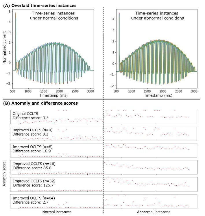 We used the improved OCLTS described in Section 4.1 to evaluate the equipment diagnostics using the motor current data of a spring-operated mechanism. Figure 5(A) (left and right) shows normal waveforms and simulated abnormal waveforms, respectively. The motor current data include a sudden spike-like waveform called “inrush,” which occurs even when the motor starts under normal operation. When the outline of the waveform is important for discriminating between normal and abnormal, this spike waveform that changes with each operation does not contribute to the discrimination between them. In addition, compared with the travel curve data in Fig. 3(A), the normal fluctuations in the horizontal axis are also large. The number of normal time-series instances and simulated abnormal time-series instances was 50 each. We used 20 of the normal instances as training data, and tested the diagnostic performance with the remaining 80 instances.
