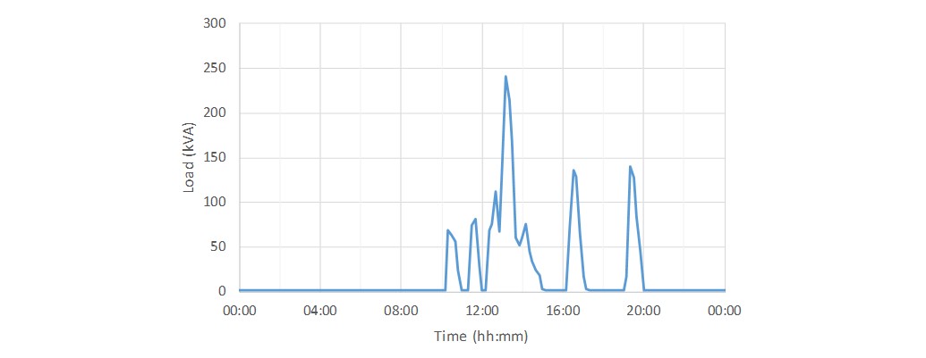Figure 4 below shows the load drawn by the charger bank on one day. As can be seen, the load is very peaked, and a charging cycle is complete within the hour. Given that the thermal time constant of the transformer oil volume is usually around 2 ½ to 3 hours, the temperature of the transformer is not expected to reach a high steady level during this load profile. This will be analysed in the next section using a thermal model.