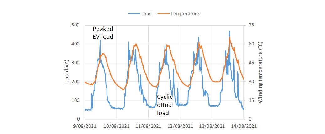 A simulation was set up to model the changes in transformer temperature based on different load profiles, shown in Figure 2. For instance, the performance of one transformer if the other failed, or if the EV charging load doubled. This simulation used the IEC 60076/7 thermal model for its base, with coefficients set to be conservatively representative of the transformer under study. The temperatures reached were evaluated for impact on the transformer.