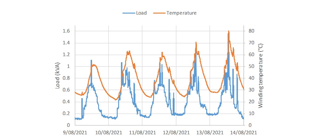 Figure 5 shows the modelling of transformer winding temperature during a high-use week, which includes the charging load shown in Figure 4. As can be seen, even with the high EV-charging peaks, the transformer temperature only increases slightly because of the high thermal constants. The winding will heat up in accordance with the four-minute thermal constant. However, once the EV charging load falls the winding will be cooled quickly by the surrounding oil. As the thermal constant of the oil is three hours in this study, the oil heats slowly and so will cool the winding effectively. The winding temperature did not exceed 70 °C despite the high load. This is significant because the paper is still ageing slowly, compared to unity ageing at 98 °C where the life of standard Kraft paper is one year [4]. The temperature rise was slowed by the thermal inertia of the insulation.