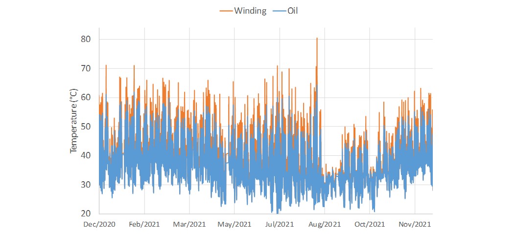 To emphasis the normal cyclic rating of a transformer, thermal modelling was performed with only one transformer connected. Even then, the total load shown in Figure 3 has not exceeded the nameplate rating of one transformer. With a view to the future, for this modelling the EV load was also doubled. Ambient temperature data, essential for the thermal modelling, was downloaded from the local weather station operated by the National Institute of Water and Atmospheric Research.
