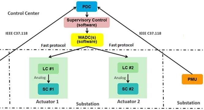 The WADC architecture adopted for Terna project is described in Figure 9. This architecture uses a phasor data concentrator (PDC) collecting Phasor Measurement Unit (PMU) measurements, to feed the Supervisory Control with the data necessary to process the set point of the WADC system, carried out by the specific software developed in collaboration with EPRI. Through a fast protocol, the WADC sends the set point to the field devices, in this case a customized PMU acts as an interface with the excitation system of the synchronous condenser. Through appropriate implementations, the excitation system injects the signal into the Automatic Voltage Regulator (AVR), which controls the excitation of the synchronous machine and allows the actual implementation of the set point.