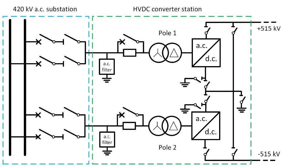 NordLink is designed as a rigid bipole system with two pole conductors without dedicated metallic or sea return. If one converter pole is out of operation due to maintenance or repair, the other converter pole can operate in monopole mode using the conductor belonging to the disconnected converter pole as a metallic return. To enable fast transition between bipole and monopole operation mode, the converter stations are equipped with a d.c. bypass arrangement with High-Speed Switches (HSS). These switches are modified a.c. circuit breakers, thus allowing for fast operation as compared to the conventional disconnectors. This enables fast transition between different configurations. These modifications mean that the a.c. breakers are re-designed for the higher 515 kV d.c. operating voltage using longer insulation distances and corona rings. The breaking chamber and the operating mechanism are not modified.
