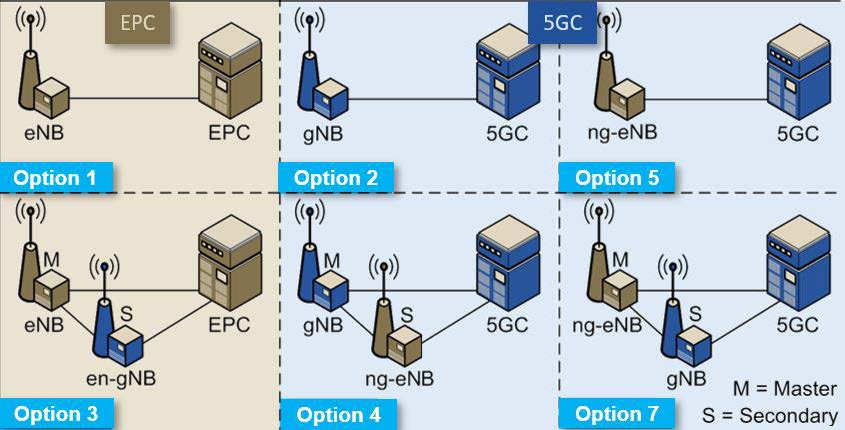 Operators have taken different strategies to exploit 5G technology. For the transition from 4G to 5G, 3GPPP has specified different deployment options [11] presented in Figure 4, most of the mobile operators have selected non-standalone (NSA) option 3x as their early 5G deployment since it allows fast deployment and effective use of existing 4G technology, it reuses the current evolved packet Core EPC and LTE base stations as the anchor for 5G. In this kind of deployment, the operators are focusing on offering full-service coverage in urban city areas. This strategy is consumer driven, targeted to offer high throughput, and eMBB by leveraging the use of carrier wider 5G frequency bandwidth, carrier aggregation (CA) and dual connectivity (DC). Some of the operators have selected option 2 or standalone option (SA) to keep 4G and 5G separate to offer dedicated private network services especially for industries. Operators that adopted this kind of deployment are concentrating on providing hotspots for private 5G networks for industrial use cases by covering smaller geographical areas. It is estimated that there will be over a million private networks in Europe by 2030 [12].